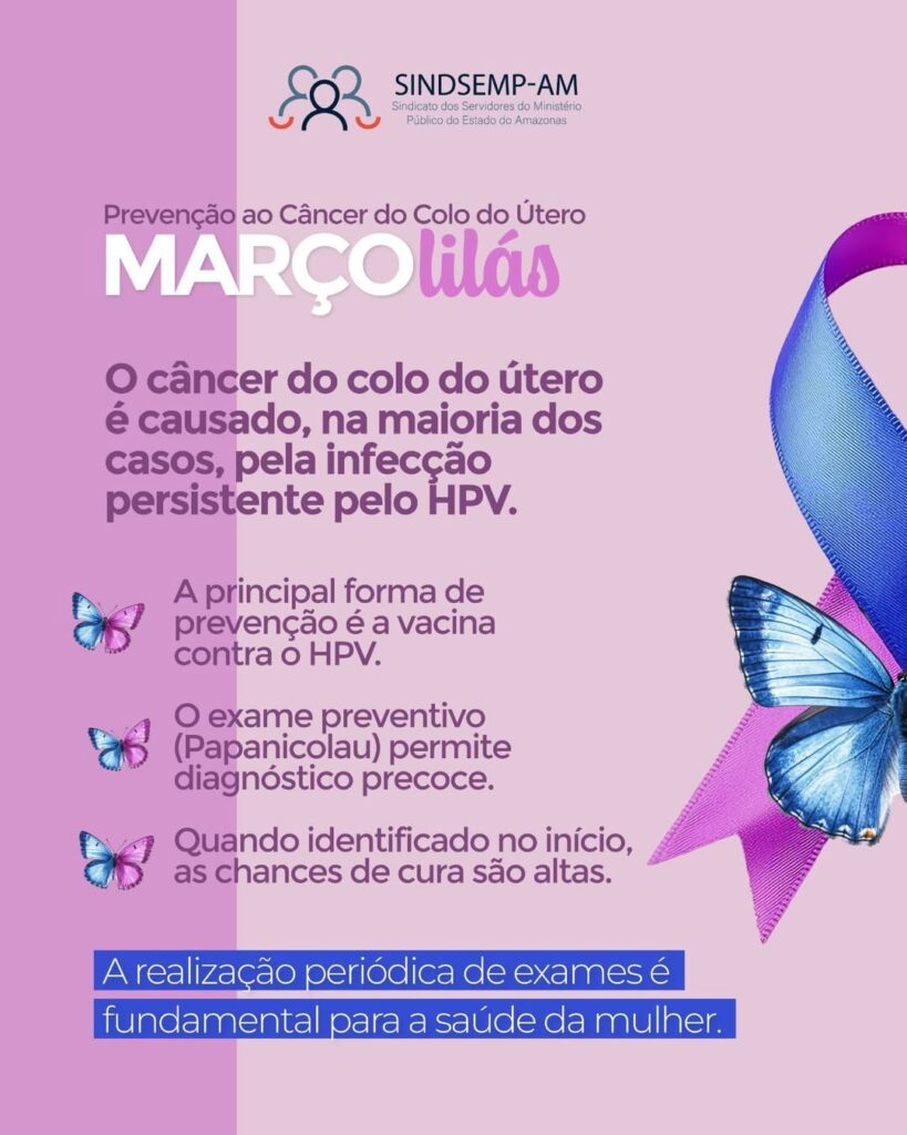 O Março Lilás reforça a importância da prevenção ao câncer de colo do útero, destacando a vacinação contra o HPV e a realização periódica do exame preventivo. 💜